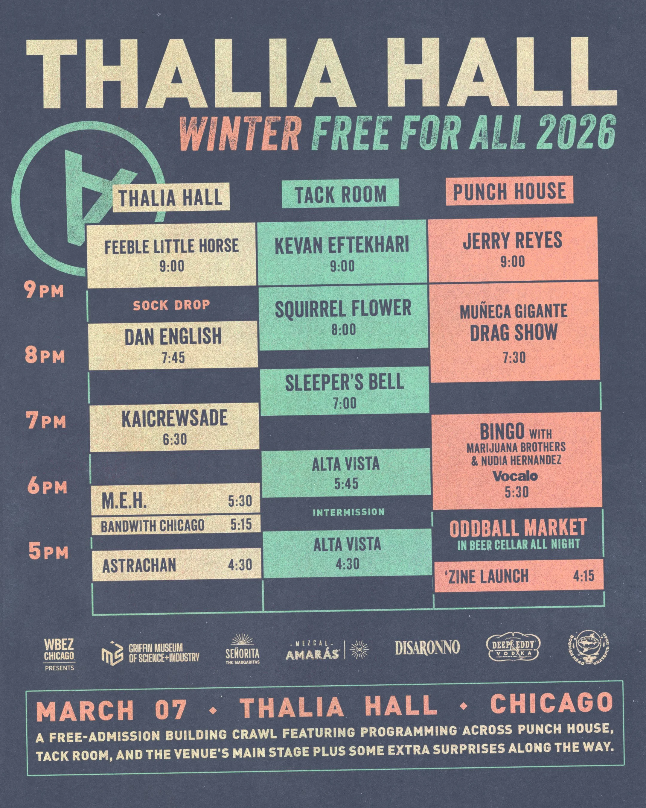 Each Winter and Summer, Thalia Hall opens all of its doors for a fully loaded edition of the Thalia Hall Free For All, a free-admission building crawl featuring programming across Thalia Hall’s main stage, Punch House, and Tack Room. Wander the building inside and out and experience live music in one of our spaces at any given point, peruse a curated vendor market, indulge in the culinary offerings, and participate in a number of games and other activities along the way!
